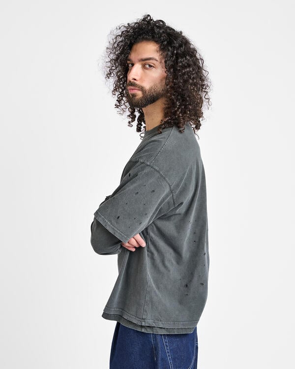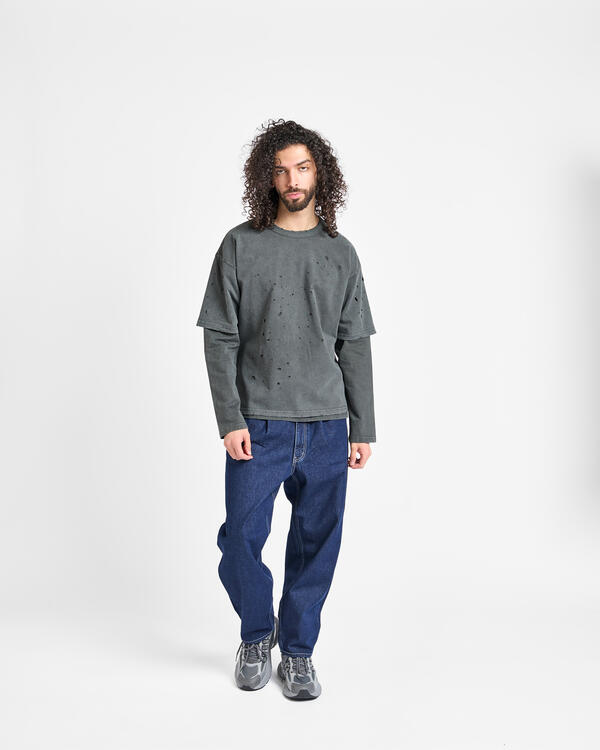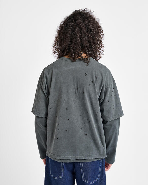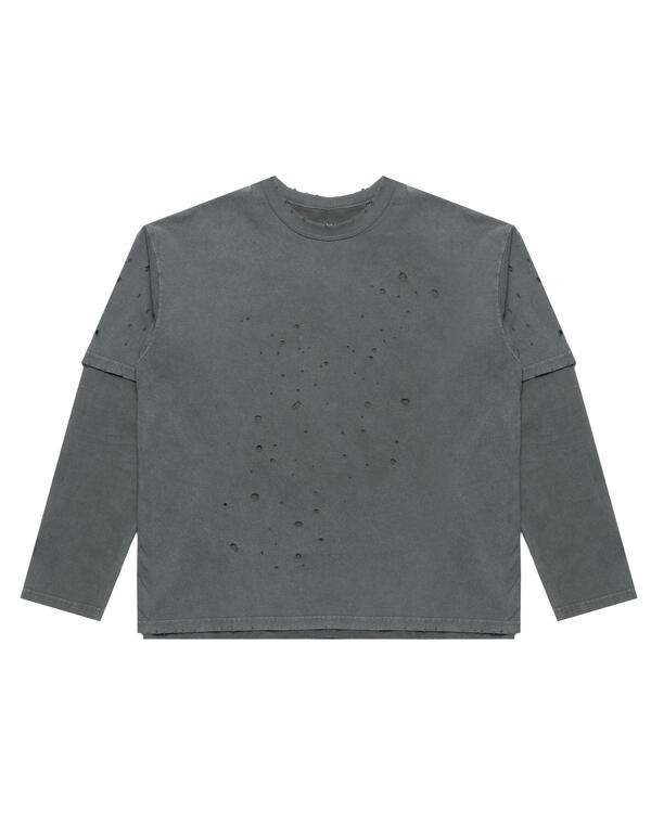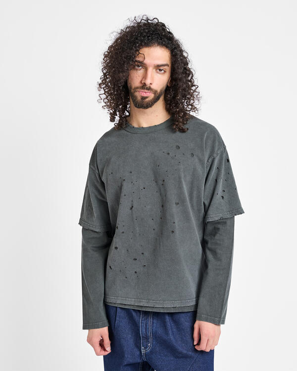 Dieses mehrlagige T-Shirt hat kurze und lange Ärmel und ist mit realistischen Abnutzungs- und Ausbleichungseffekten versehen, um den Eindruck jahrelanger Nutzung zu erwecken.