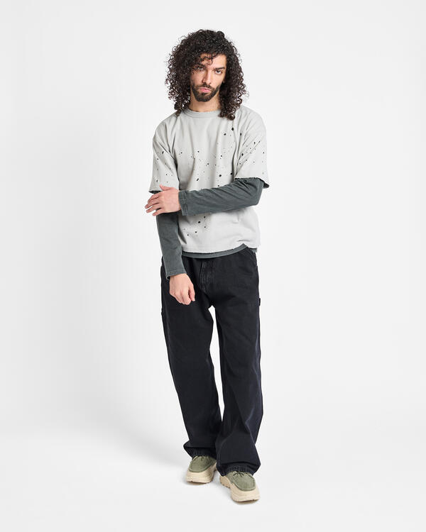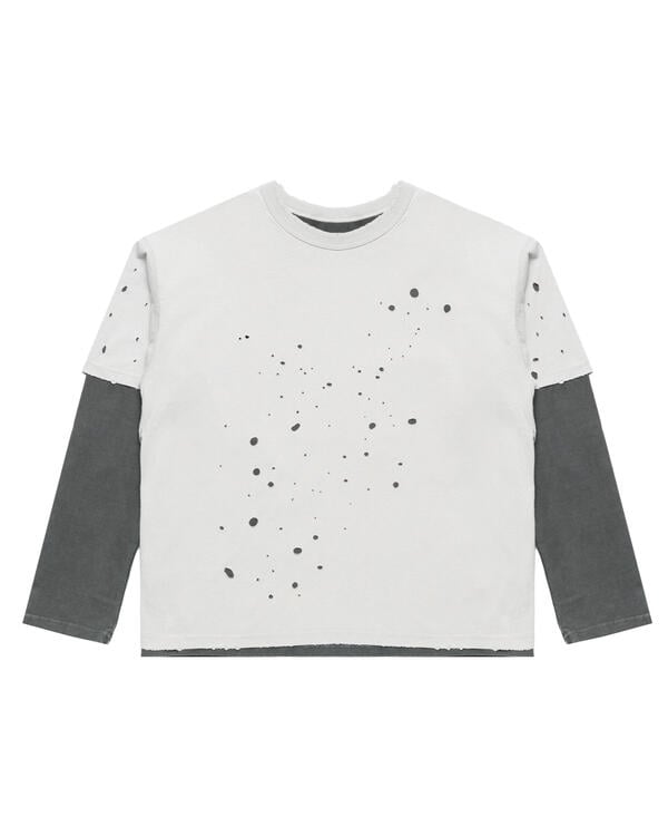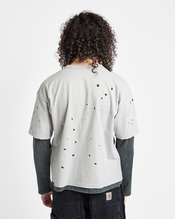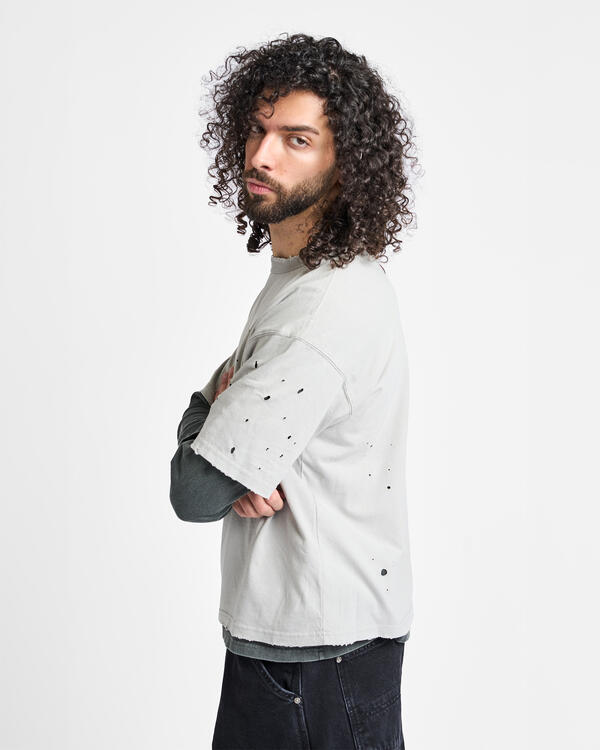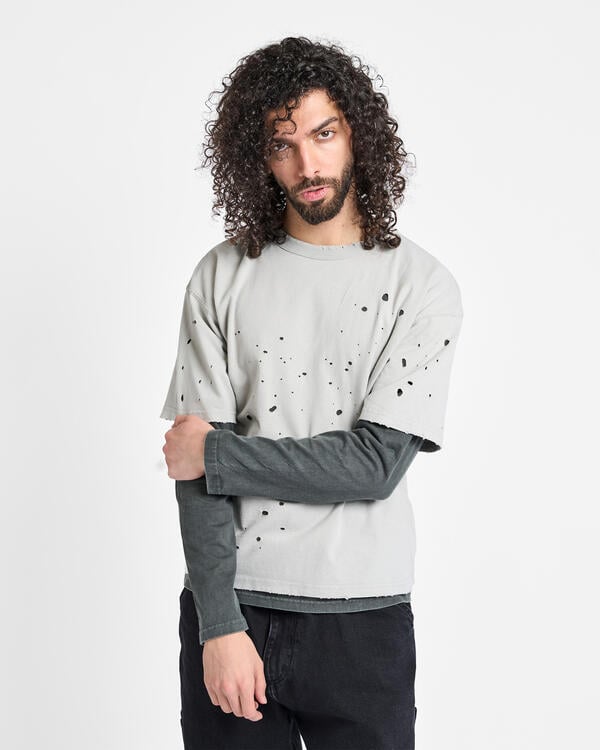 Dieses mehrlagige T-Shirt hat kurze und lange Ärmel und ist mit realistischen Abnutzungs- und Ausbleichungseffekten versehen, um den Eindruck jahrelanger Nutzung zu erwecken.