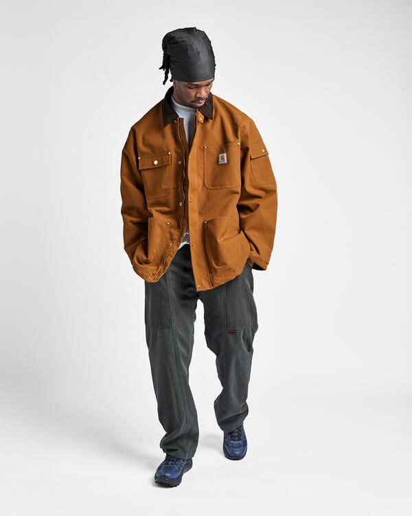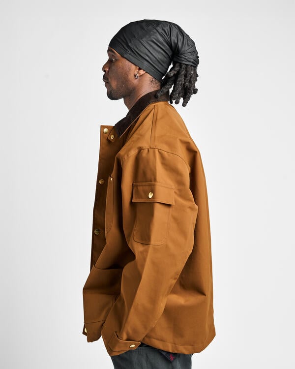 Die Clapton Jacket besteht aus einem gefütterten, mittelschweren Nylon-Canvas. Der Style hat einen Kordkragen, der mit einem geknöpften Riemen geschlossen werden kann. Die Jacke ist außerdem mit einem Zwei-Wege-Reißverschluss und Knöpfen ausgestattet und kann an den Manschetten und dem Bund verstellt werden. Auf der Vorderseite befinden sich vier mit Nieten verstärkte Taschen, zusammen mit einer zusätzlichen Tasche auf einem der Ärmel. Ein gewebtes Square Label auf der Brust rundet das Design ab.
