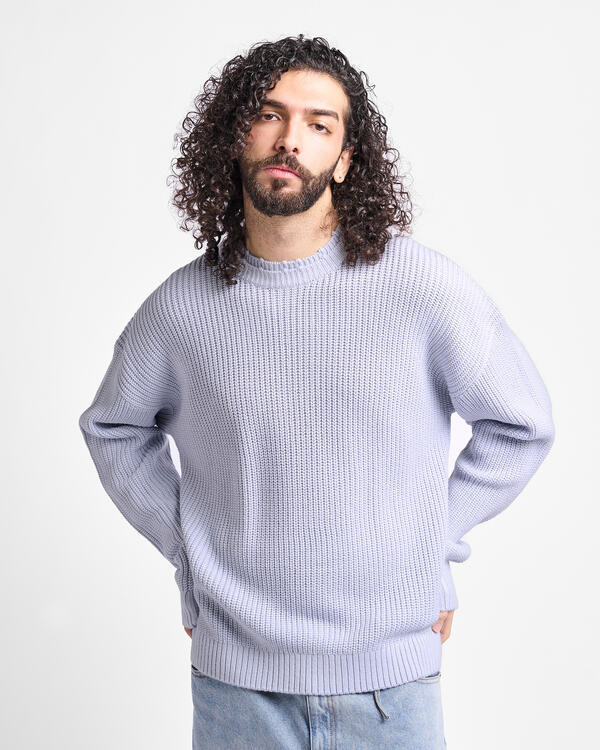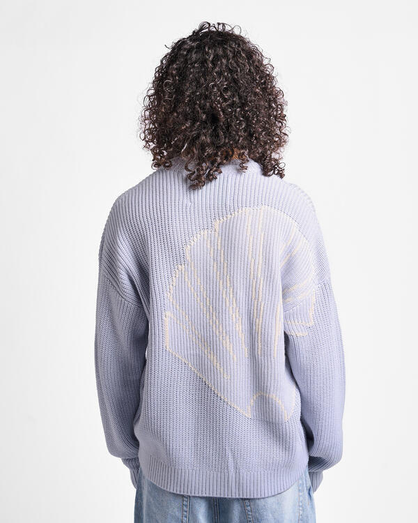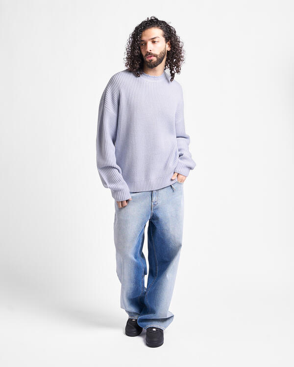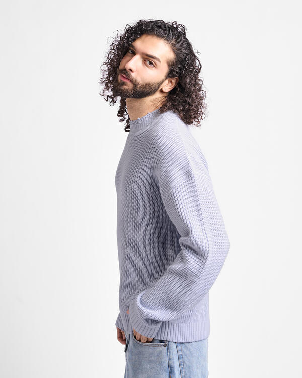 Strickpullover mit runder Halsöffnung in Hellblau für Damen und Herren, mit weißem Jacquard-Oyster-Logo auf der Rückseite. Aus einem Merinowoll-Mischgewebe.